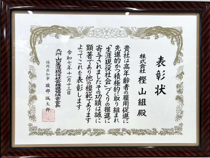 このたび弊社は、年齢にかかわりなく働き続けられる環境づくりや高年齢者の雇用促進に向けた取組が評価され、九州・山口生涯現役社会推進協議会会長表彰を受賞しました。